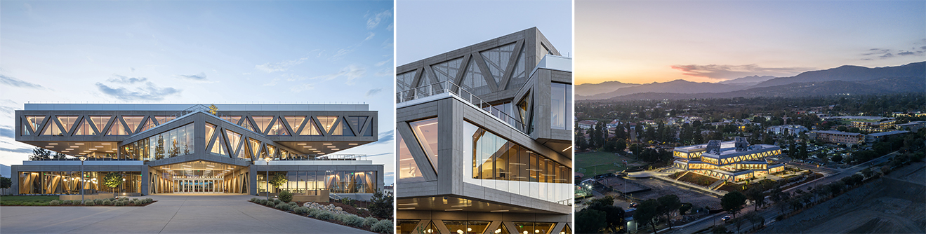 建築外牆採用了仿木紋理的玻璃纖維強化混凝土(GFRC)板材,保留混凝土的耐用與防火特性,又賦予了外觀有機且溫潤的質感。室內支撐每一層體塊的巨大的三角形鋼桁架被包覆在木材中,為冰冷的實驗空間注入自然溫暖的氣氛。地面層的商店、咖啡館與大型社交樓梯形成整座建築的心臟,促進跨學科的對話。樓上是基因組學、氣候研究及大腦科學、高速運算等尖端實驗室。屋頂設置了超過一萬平方英呎的太陽能板,且建築層間的懸挑結構提供了自然的遮蔭效果,有效降低了空調能耗,展現了環保與美學並重的設計高度。本案為BIG在洛杉磯的第一件作品。