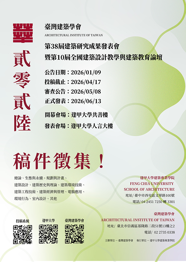 由臺灣建築學會主辦之「建築研究成果發表會」已邁入第38屆,「全國建築設計教學與建築教育論壇」也來到第10屆。兩項活動長期致力於推動建築研究與設計教育之學術交流,強化建築產、官、學界之跨域對話,亦促使臺灣建築學術發展持續深化,並穩健邁向國際接軌。第38屆建築研究成果發表會暨第10屆全國建築設計教學與建築教育論壇,訂於2026年6月13日(六)舉行,由逢甲大學建築專業學院(臺中市西屯區文華路100號)承辦。即日起開放論文徵稿,截止日期為2026年4月17日(五),審查結果預計於2026年5月8日(五)公告,誠摯邀請參與。