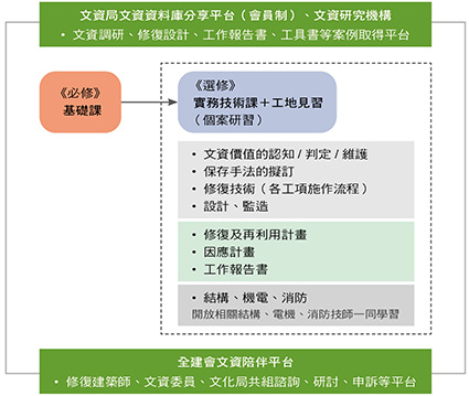 在文化部文化資產局的支持下,全建會文資委員會開始進行古蹟規劃設計及監造培訓班的課綱編撰,藉由小型、多場次的分區座談會,了解國內古蹟規劃設計及監造從業人員執業的困境與需求後,再擬定未來培訓課程的方向及課綱。