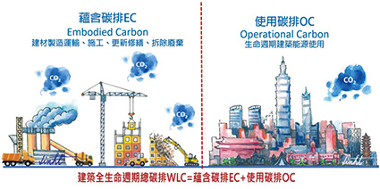 其實,林憲德教授早在建築師雜誌2017年12月號中撰稿了「由綠建築到建築碳足跡」一文,而建築師雜誌2023年7月更出版了「零的挑戰-永續及近零建築新趨勢」一書,孫振義教授於建築師雜誌2025年1月號中亦已撰寫了「建築能效標示之國際趨勢與在台實踐」。本文將聚焦於蘊含碳排的方法論與政策配套,建議讀者亦可搭配閱讀上述出版物,當可全面性理解建築碳排的全貌。
