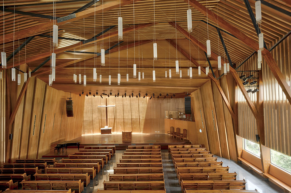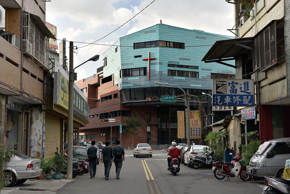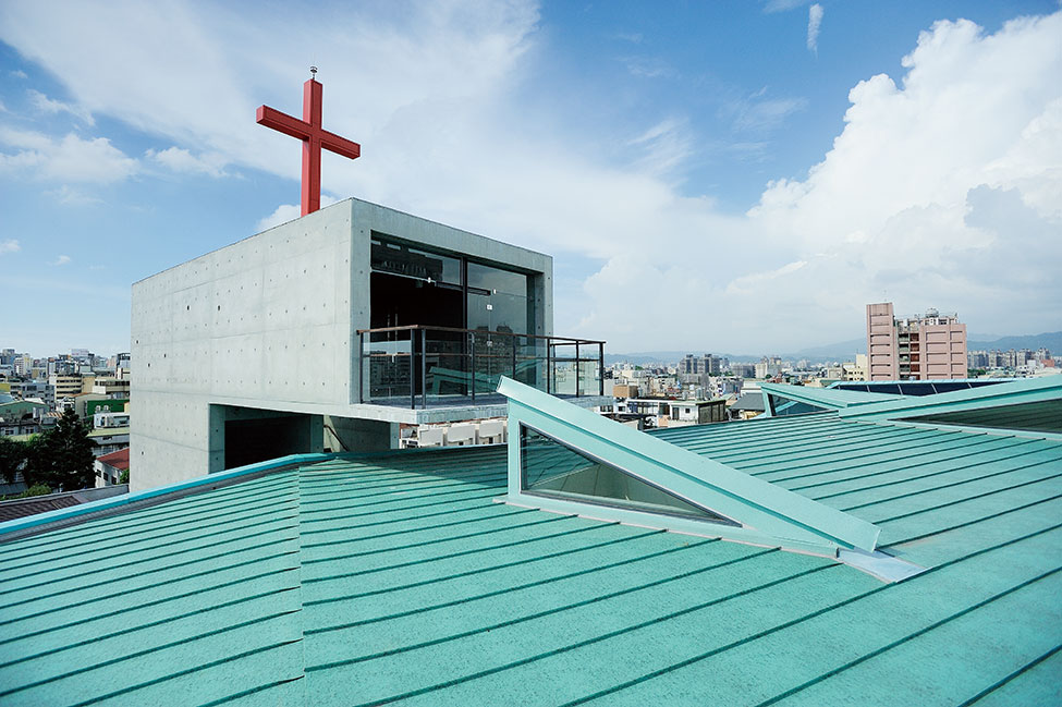 在配置上以舊有忠孝路入口為起點,延伸既有中央景觀綠廊與新堂區串聯,舊入口寧靜安和,附近為學校及幼兒園,新入口在30米建成路上車陣喧囂,走在中央綠廊,量體由低至高,空間由靜而動,利用兩側多孔隙的開放空間,與鄰里巷弄連接在一起,居民得以自由的進出教會,來交談、停留、聚集參加各種活動,真正實現無牆教會,成為社區的福音中心,常民的精神性聚集場所,與常民生活真實的結合。