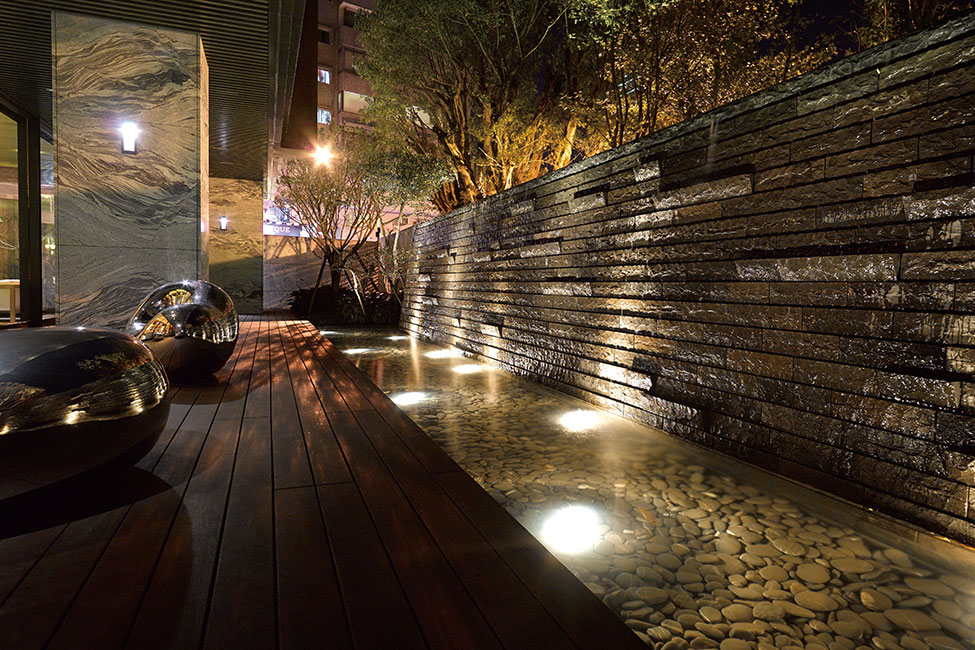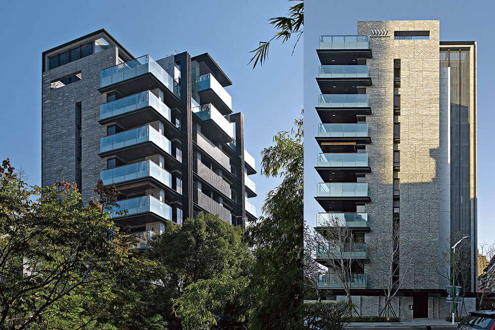 面臨磺溪、陽明山系,本案適切的將建築配置於景觀面,另沿天母西路因車流繁雜,故採俐落之肌理牆體,減緩室內噪音。
