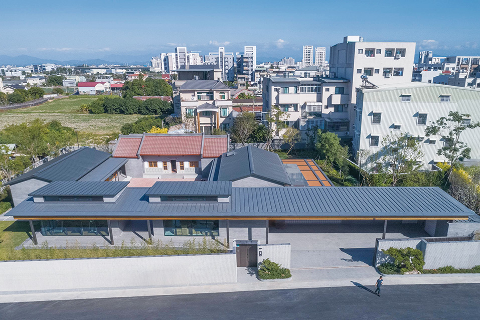 新構築宅院承襲了原宅的坐向與空間軸線,亦延續傳統院落的內聚秩序。在整體比例與量體高差上謹慎拿捏,透過高度漸進的手法營造視覺節奏:自左右護龍的交誼空間向中央主屋正身遞進抬升,呈現主從分明的層次轉換,不僅尊重原有合院形式,亦形塑家人聚合與交流的核心場域。