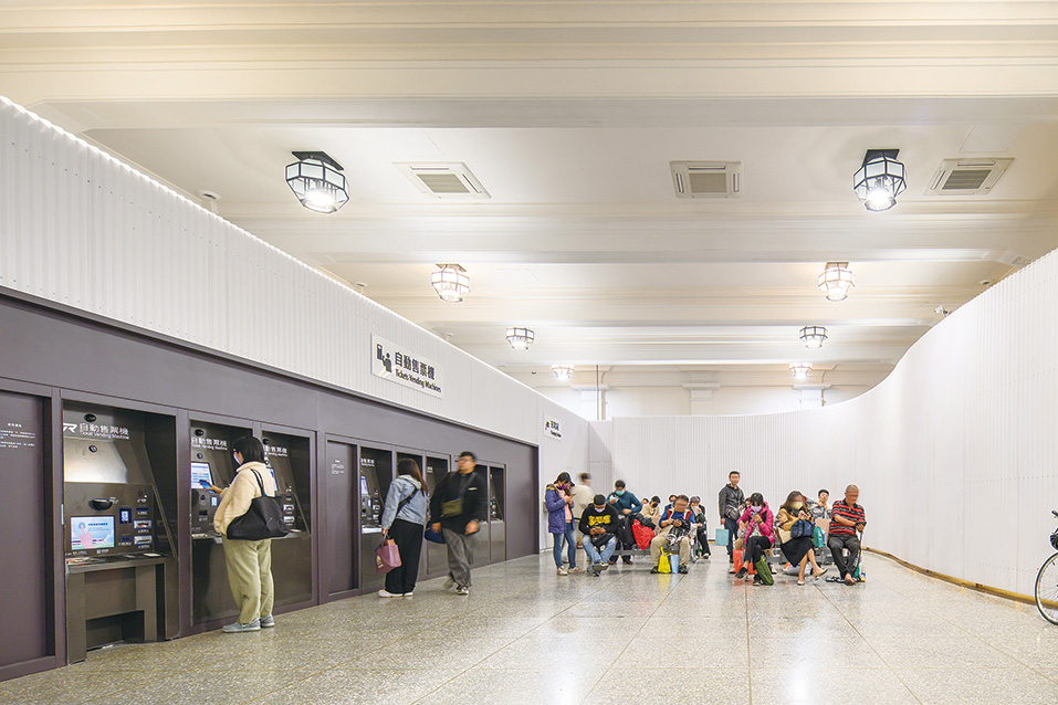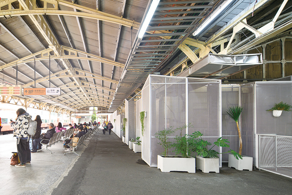 半透材質、露出縫隙的鷹架,讓樸華的古蹟立面微露,在優化牆面與照明後,更是映出了挑高大廳的優雅與氣度。在施工圍籬與植栽襯托之下,與月台棚架的井然秩序之間,新舊並融的建築樣貌和現代指標便當服務設施,在臨時修復過渡期間,不但為古都車站掃除施工時的剛硬氛圍,更是增添一縷綠意花園的生活感。